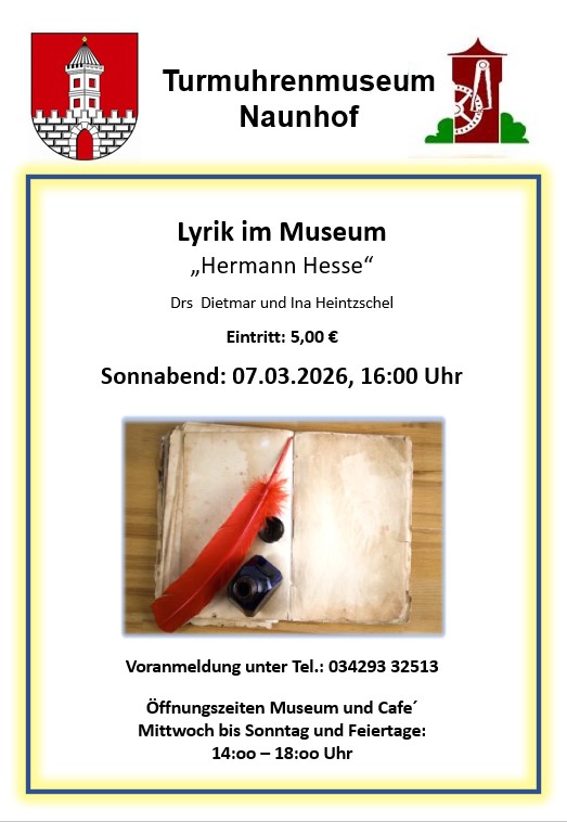 Die Veranstaltungsreihe: „Lyrik im Museum“ ist in den vergangenen Jahren sehr gut bei den Naunhofern und Ihren Gästen angekommen, daher ist eine Fortsetzung auch für das Jahr 2026 geplant.